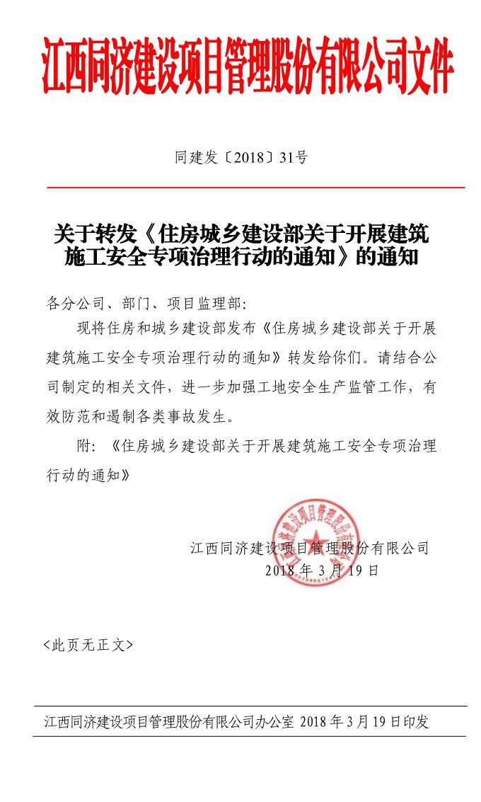 同建發(fā)[2018]31號(hào)關(guān)于轉(zhuǎn)發(fā)《住房城鄉(xiāng)建設(shè)部關(guān)于開(kāi)展建筑施工安全專(zhuān)項(xiàng)治理行動(dòng)的通知》