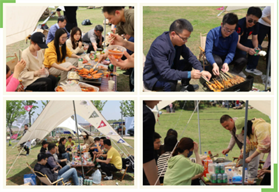 驅(qū)車來到空氣清新、風(fēng)景如畫的贛江新區(qū),湖邊草地上早已支起了一座座帳篷。架起燒烤架,擺上美味小食,各位員工紛紛化身“大廚”,現(xiàn)場(chǎng)煙火與香味齊飛。沐浴陽光、自助燒烤、舉杯暢飲、開懷暢談……員工們?cè)陂e暇時(shí)光體驗(yàn)精致戶外生活,在大自然中盡享舒適愜意。