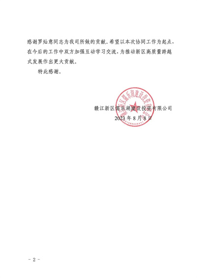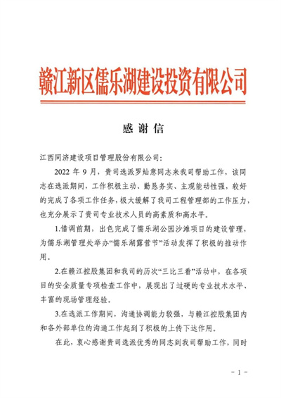 近日,同濟建管收到贛江新區(qū)儒樂湖建設投資有限公司發(fā)來的感謝信,稱贊同濟建管外派員工羅燦意工作積極主動性強、專業(yè)技術(shù)水平過硬、現(xiàn)場管理經(jīng)驗豐富,在儒樂湖公園沙灘項目及安全質(zhì)量專項檢查工作中發(fā)揮了積極作用,并希望以本次協(xié)同工作為起點,在今后的工作中雙方加強互動學習交流,為推動新區(qū)高質(zhì)量跨越式發(fā)展作出更大貢獻。