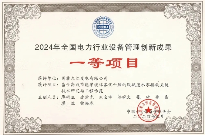 課題《基于高效節(jié)能單流體霧化干燥的脫硫廢水零排放關(guān)鍵技術(shù)研究與工程示范》榮獲“2024年全國(guó)電力行業(yè)設(shè)備管理創(chuàng)新成果一等項(xiàng)目”。