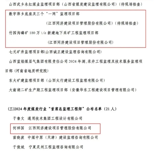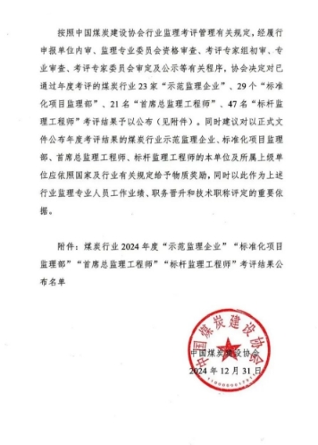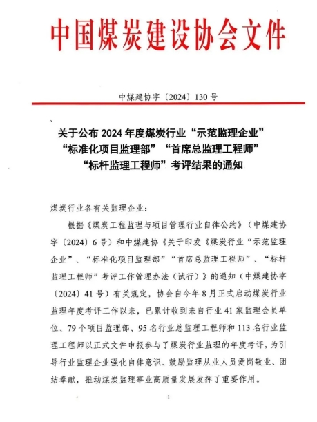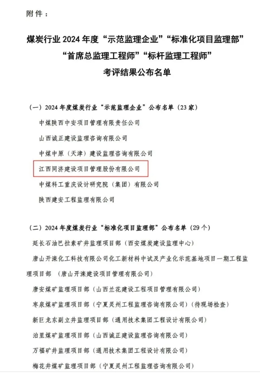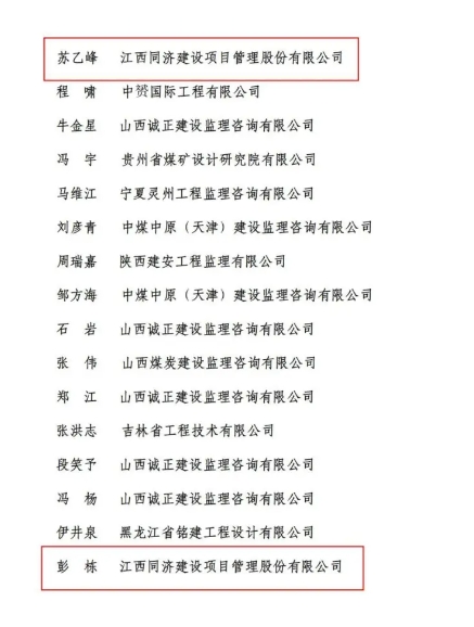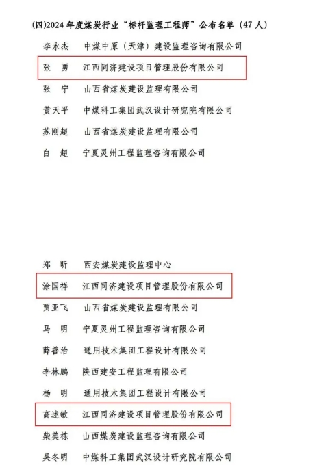 同濟建管主要負責(zé)人獲得2024年度煤炭行業(yè)“首席總監(jiān)理工程師”;張勇、涂國祥、高述敏、蘇乙峰、彭棟獲得2024 年度煤炭行業(yè)“標(biāo)桿監(jiān)理工程師”。