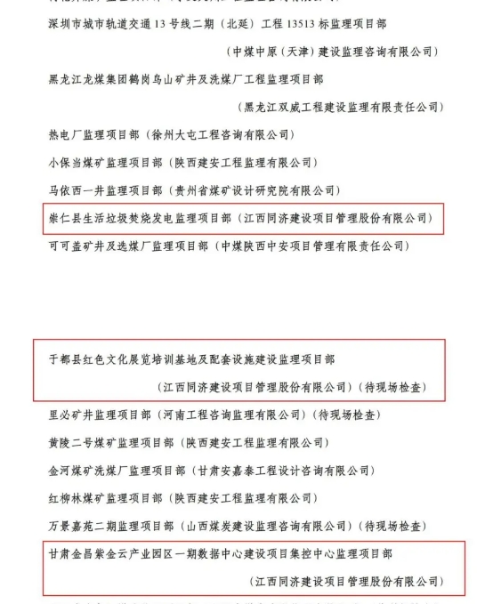 燒發(fā)電監(jiān)理項目部、于都縣紅色文化展覽培訓(xùn)基地及配套設(shè)施建設(shè)監(jiān)理項目部、甘肅金昌紫金云產(chǎn)業(yè)園區(qū)一期數(shù)據(jù)中心建設(shè)項目集控中心監(jiān)理項目部、數(shù)字萍鄉(xiāng)底座及三個“一網(wǎng)”監(jiān)理項目部、竹園溝磷礦 180 萬 t/a 新建地下采礦工程監(jiān)理項目部獲得2024 年度煤炭行業(yè)“標(biāo)準(zhǔn)化項目監(jiān)理部“。
