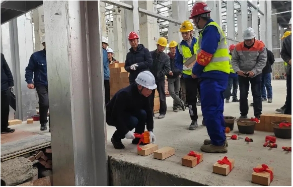 儀式最后,漆云飛宣布安源玻璃項目窯爐砌筑安裝工程正式開工。鞭炮齊鳴,現(xiàn)場氣氛達到高潮。與會領導戴上手套,與大工一同砌下第一塊磚,開啟項目建設新篇章。